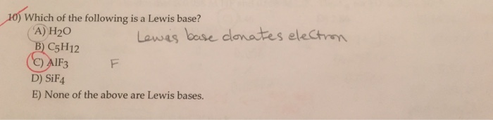 Have lone pair of electrons and act as lewis bases. A AlF3 B H2O C SiF4 D C5H12 E None of the above are Lewis bases. Can be a substance that does not contain a hydrogen atom.